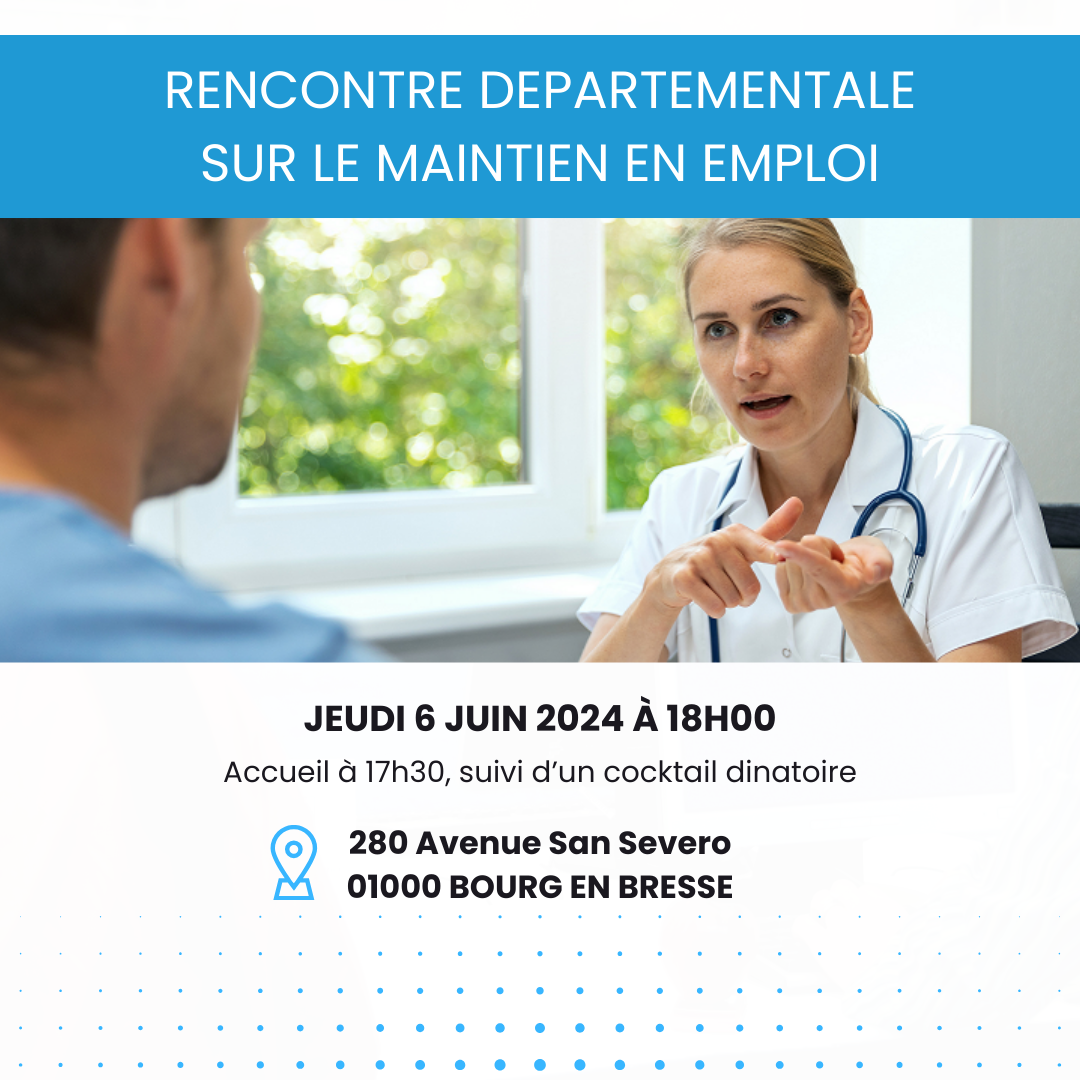Le 30 avr. 2024PRESTA AIN ET BEAUJOLAIS et le CAP EMPLOI 01 invitent les entreprises et les professionnels de santé de l'Ain et du Beaujolais à participer à la rencontre départementale sur le maintien emploi organisée le jeudi 6 juin 2024 à 18h00 au 280 avenue San Severo à Bourg-en-bresse (Accueil à 17h30, suivi d'un cocktail dinatoire).